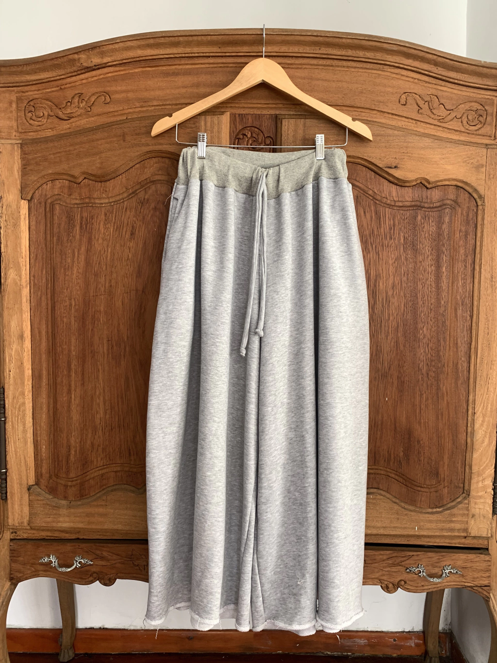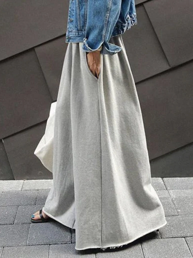 Palazzo y buzo confeccionado con algodón rústico peinado. Tiene buena caida y es holgado. La cintura y los puños son de gris más oscuro que le dan un contraste moderno y estiloso.