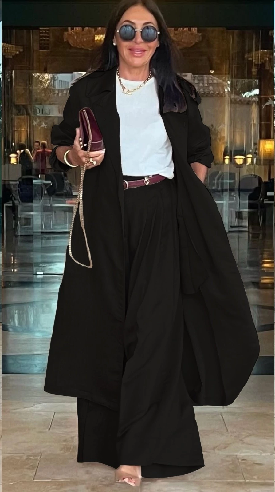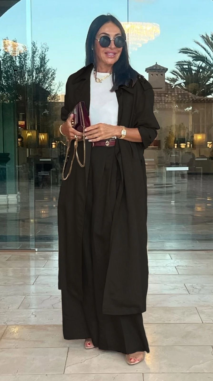El Equipo Next está confeccionado con gabardina de algodón premium importada, garantizando una calidad excepcional. Este conjunto incluye un spolverino largo y un palazo pinzado con cintura elastizada, ideal para un look elegante y cómodo.